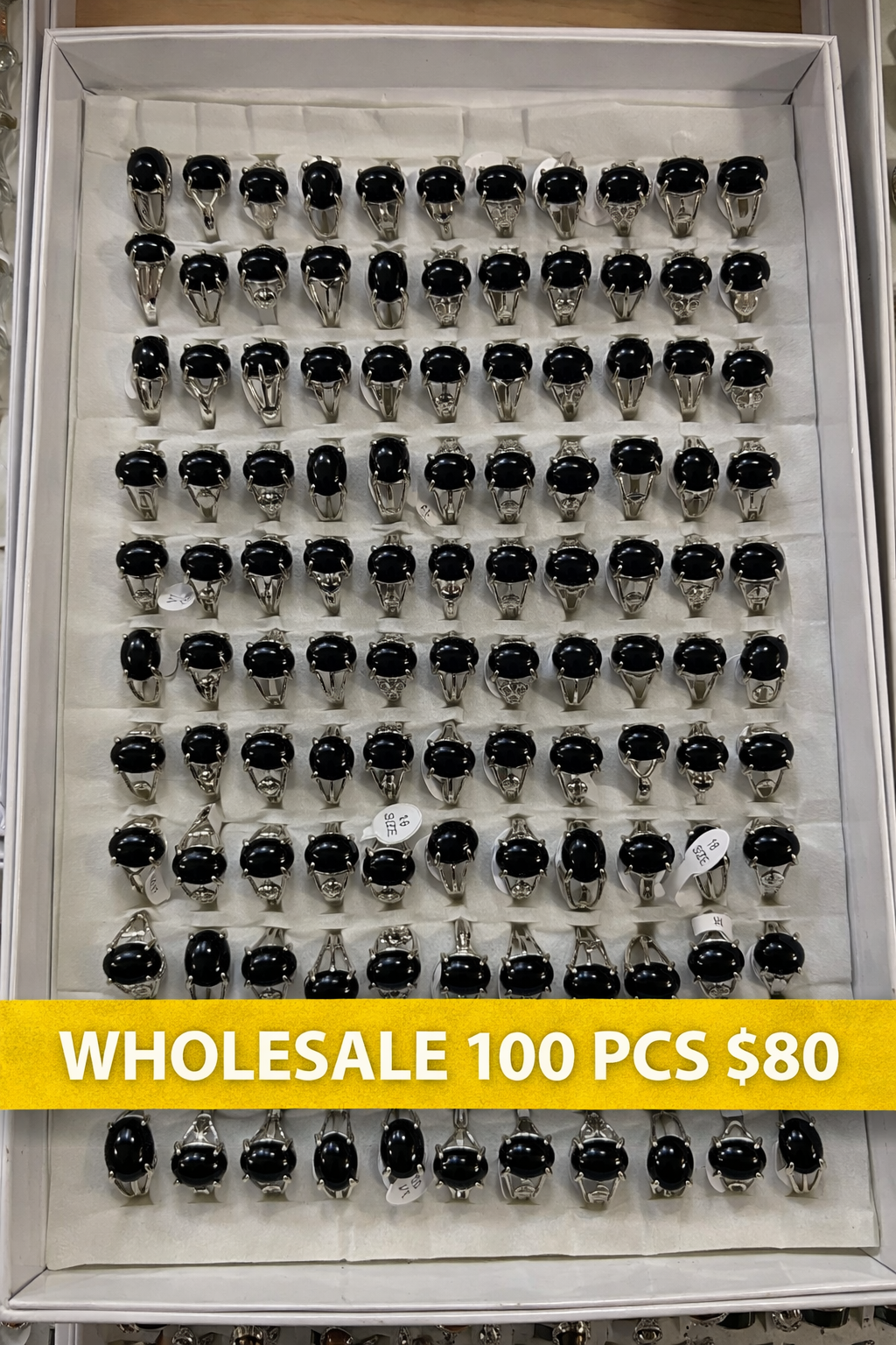 Stock up with this high-value wholesale ring lot, ideal for resellers looking for strong margins and consistent styles. This set includes 100 silver-tone rings, each featuring a polished black oval stone set in detailed, classic metal designs.